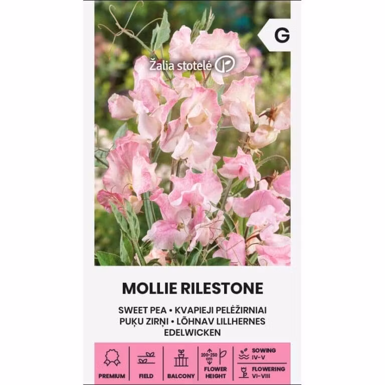 Luktärt mollie rilestone är ettåriga klätterblommor som blir 2–2,5 meters höjd. Eftersom denna sort är en av de mest dekorativa har den fått ett antal utmärkelser. Dess blommor är vågiga, mycket vackra och har en behaglig doft. Denna växt trivs i en solig, vindtät plats med humös jord. Det rekommenderas att gro fröna och sedan så dem i fuktig jord. De måste sås i grupper om 3 till 5 frön nära stöden. Söta ärtor kan användas för att skapa en doftande blommande vägg för sommaren. Dessa blommor ser bra ut i buketter.