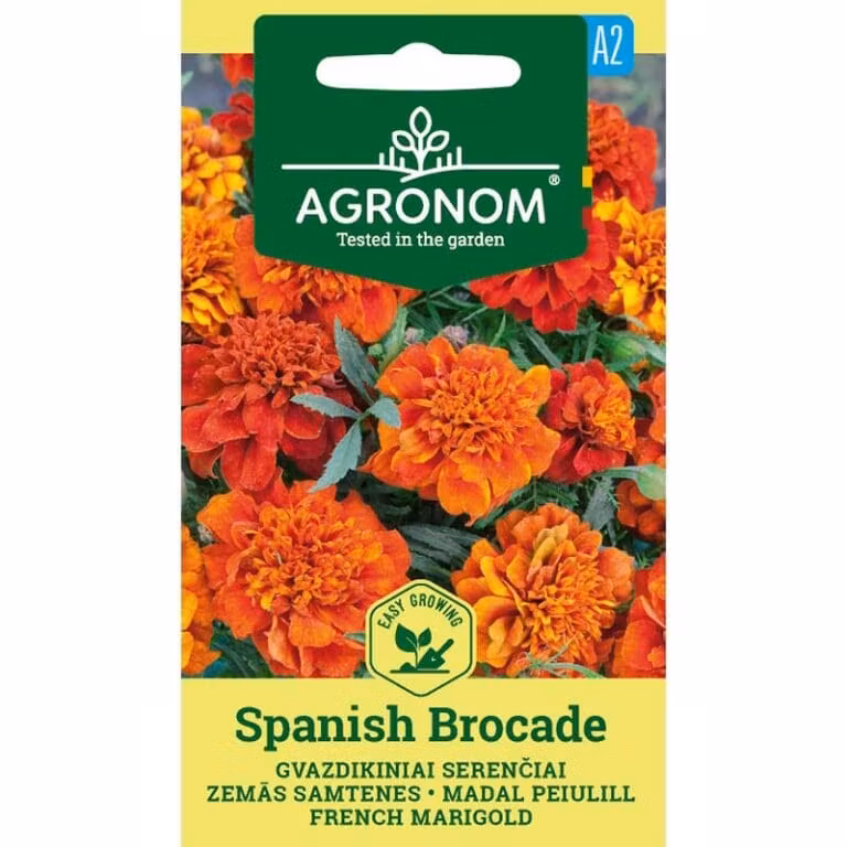 Sammetstagetes Spanish brocade får blommor som är 5–6 cm i diameter. Lämplig för planteringslådor, blomsterträdgårdar, kyrkogårdar och krukor. Plocka bort vissna blommor för att främja och förlänga blomningen.
