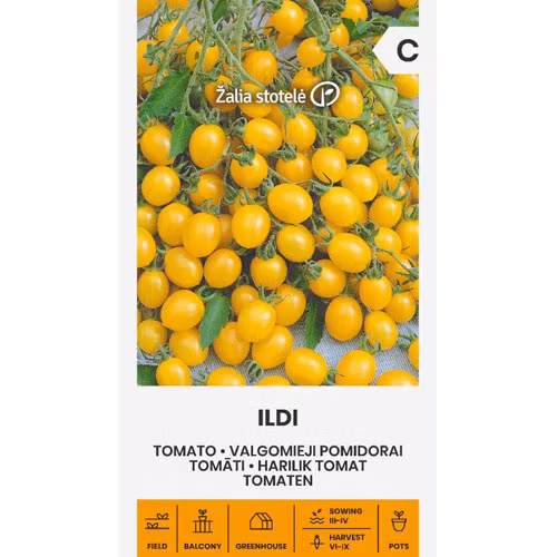 Ildi – körsbärstomatär en tidig sort, med begränsad växthöjd: den blir 150–180 cm. Frukter är små, plommonformade, saftiga, söta och väger cirka 15 g. En klase kan ha 50–80 frukter. Odlas i växthus, på balkong och på friland. Används färska och till konservering. Tomater rikligt vattnas under första halvan av dagen med varmt vatten 1–2 gånger i veckan.