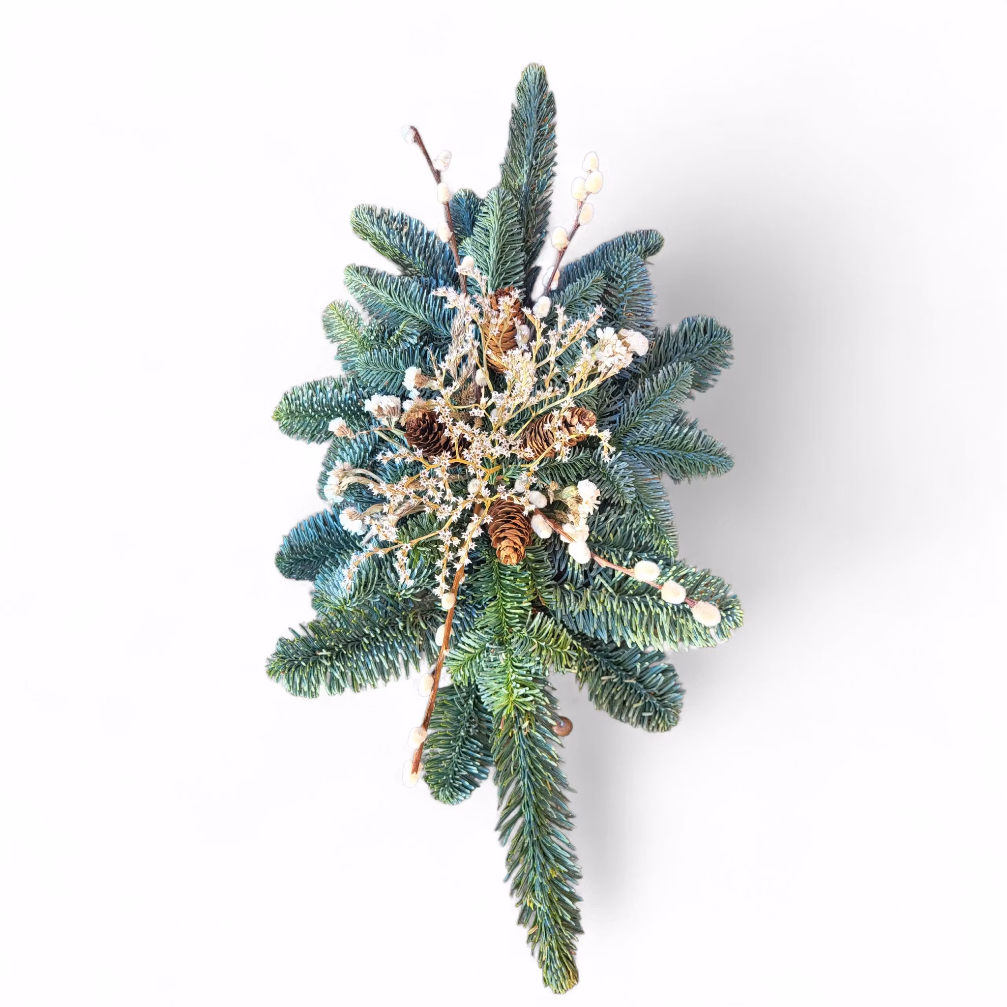 Gravdekoration liggande ca:65x30cm gjord på ädelris, torkade blommor, kottar