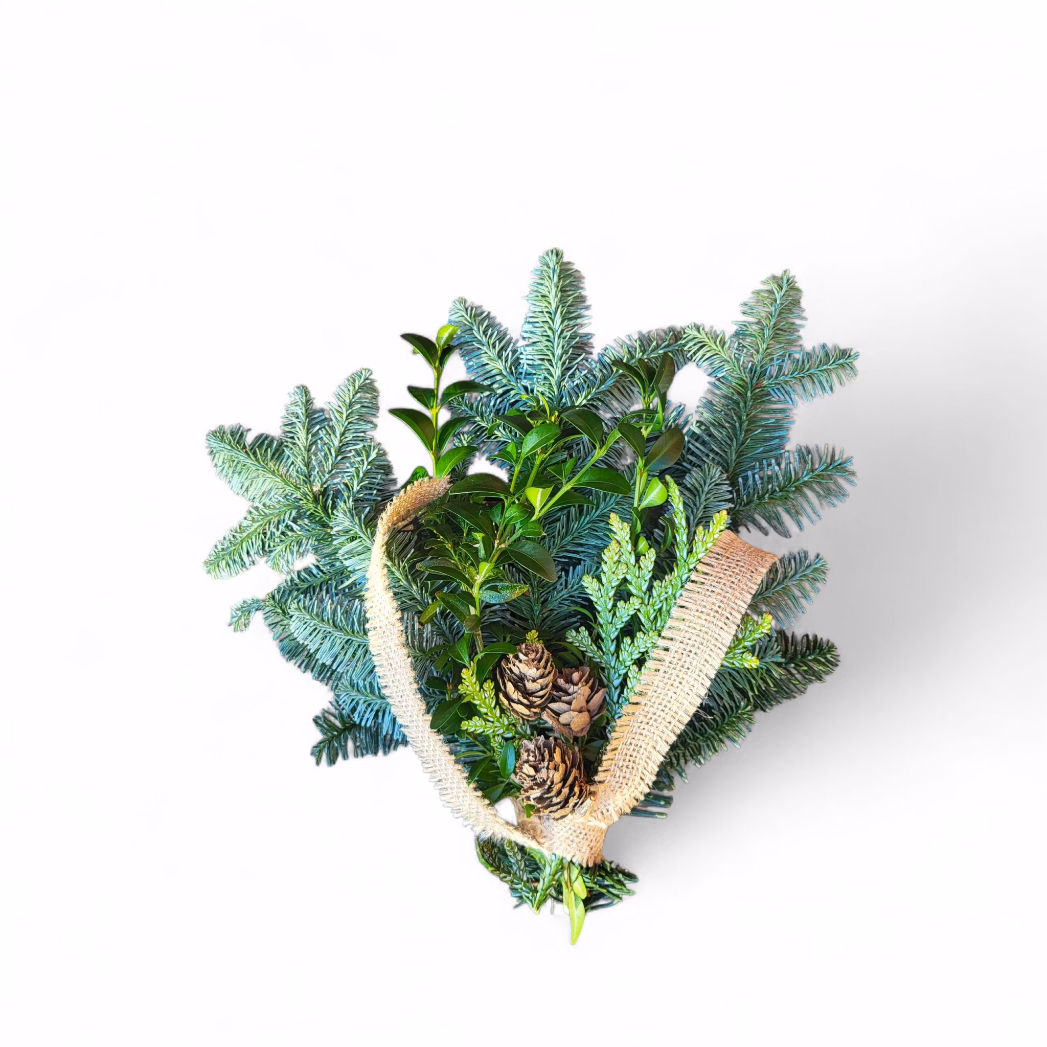 Gravdekoration liten bukett gjord på ädelris, boxbom, kotte/torkad blomma och band.