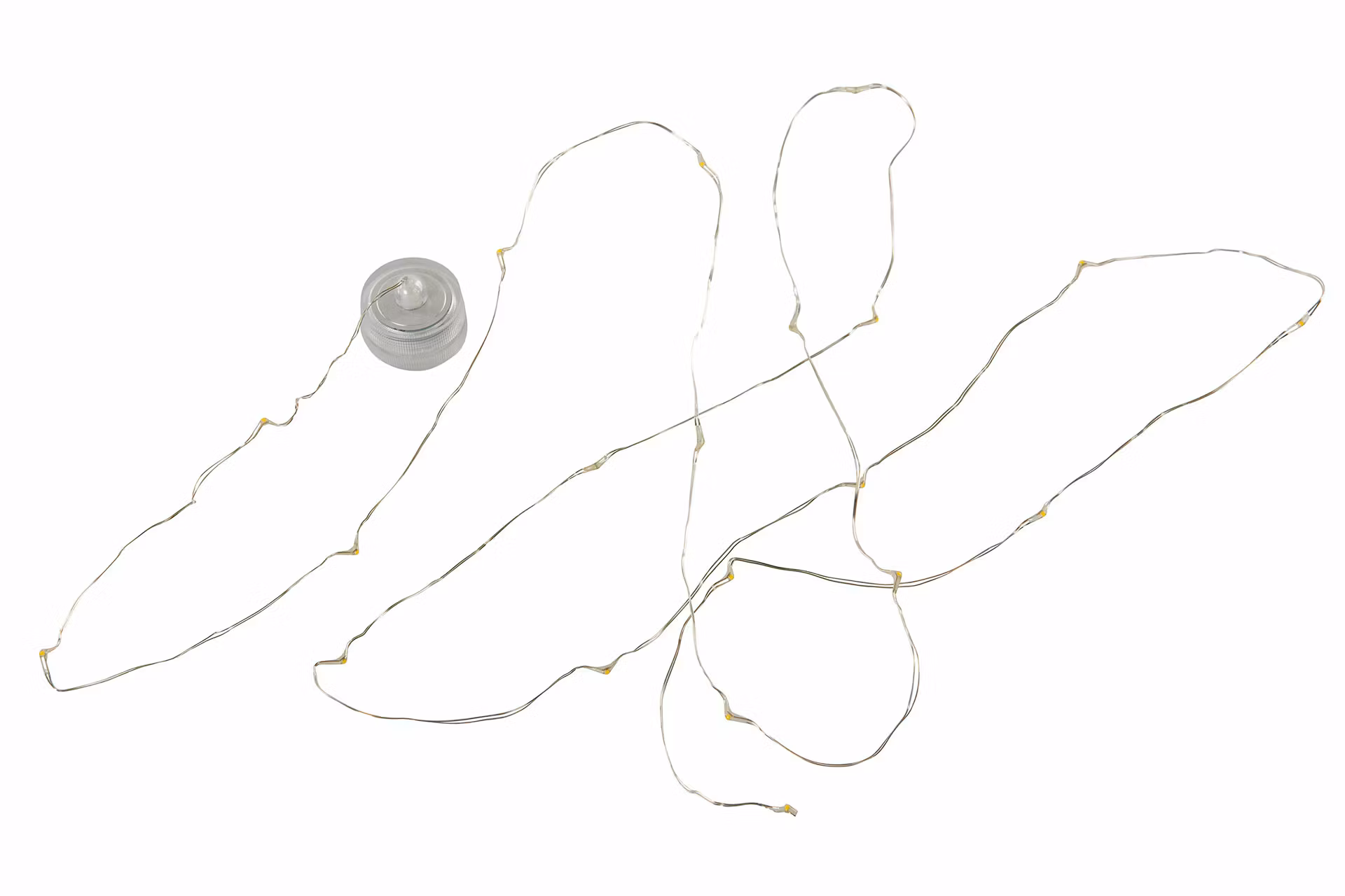 Batteri: 2xCR2032 (ingår). Batteritid: 72 timmar. 20 lampor.