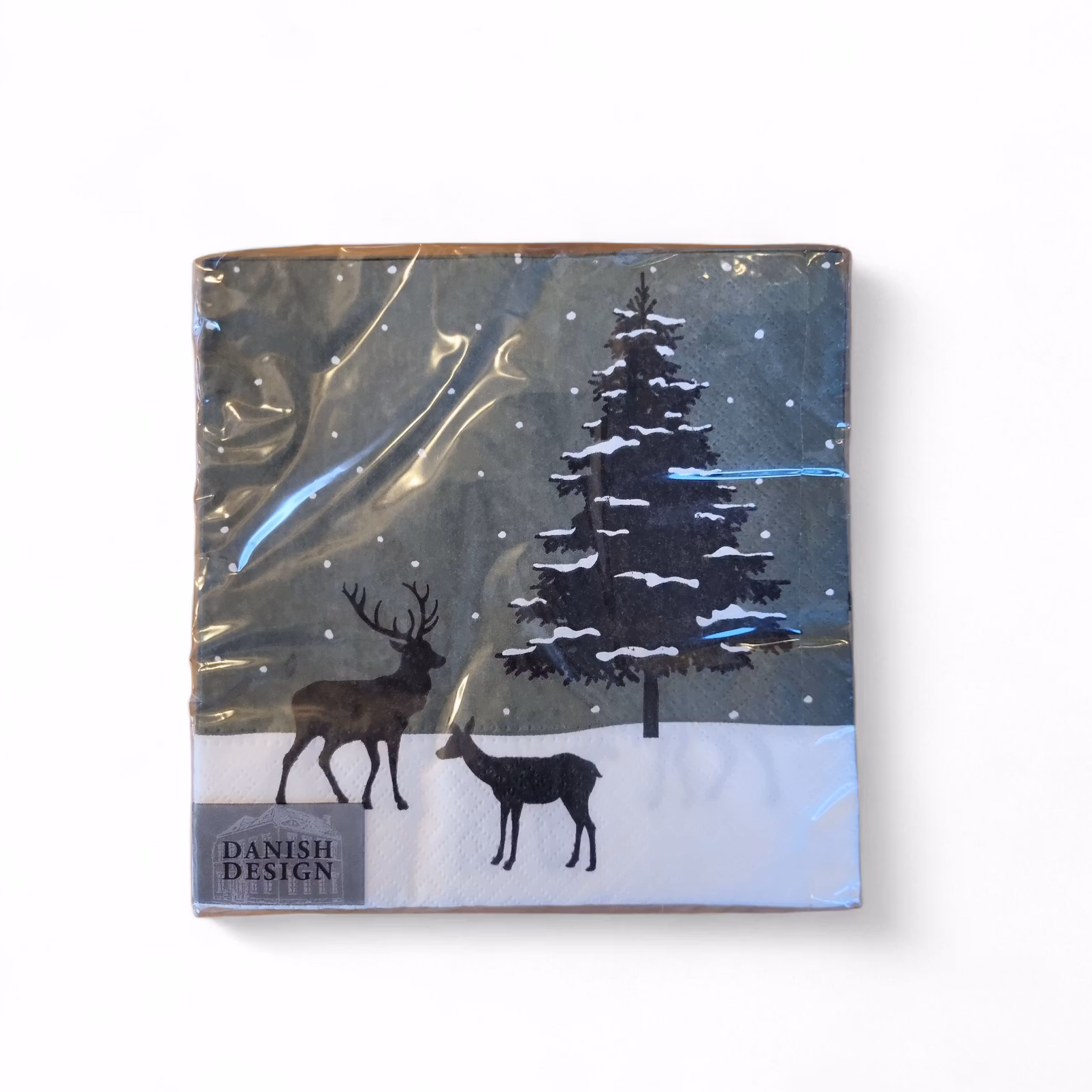 3-lagers servett i grönt och vitt skogslandskap med hjort.
