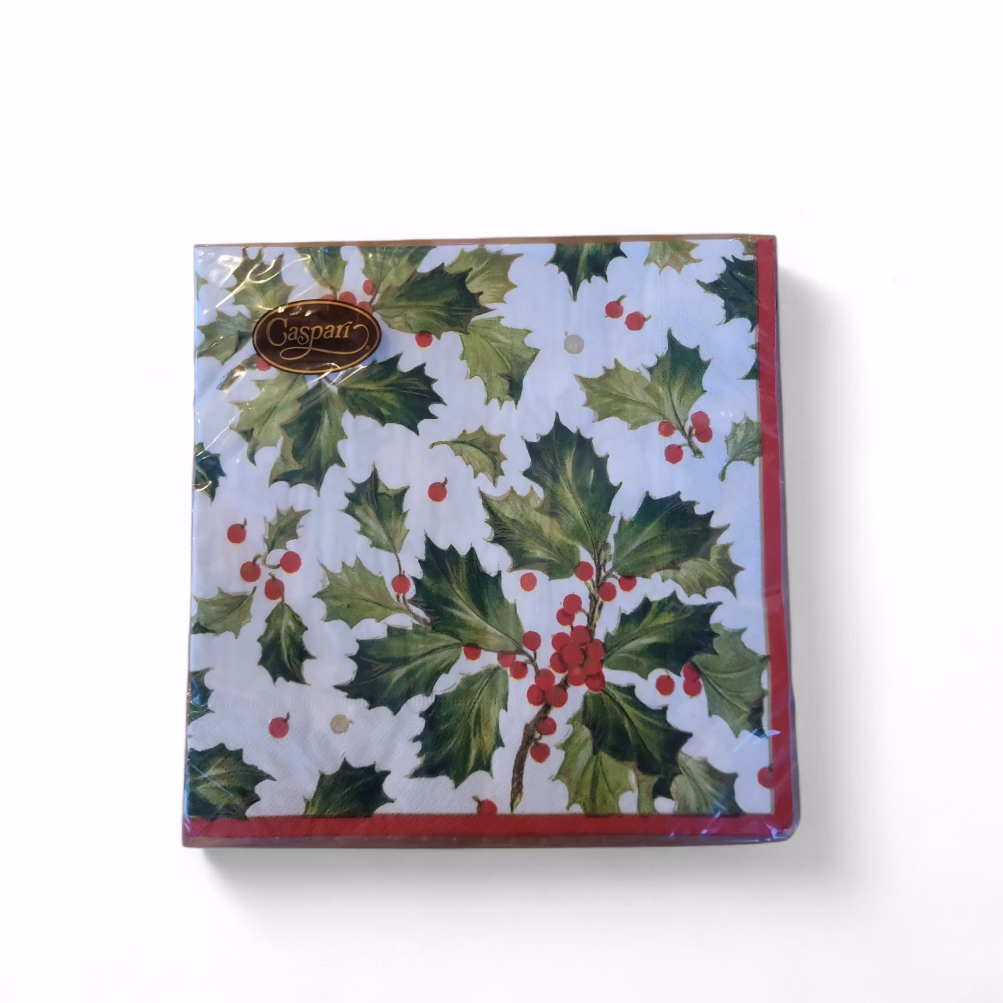 3-lags servett i vitt med ett mönster av järnek i grönt och röda bär.