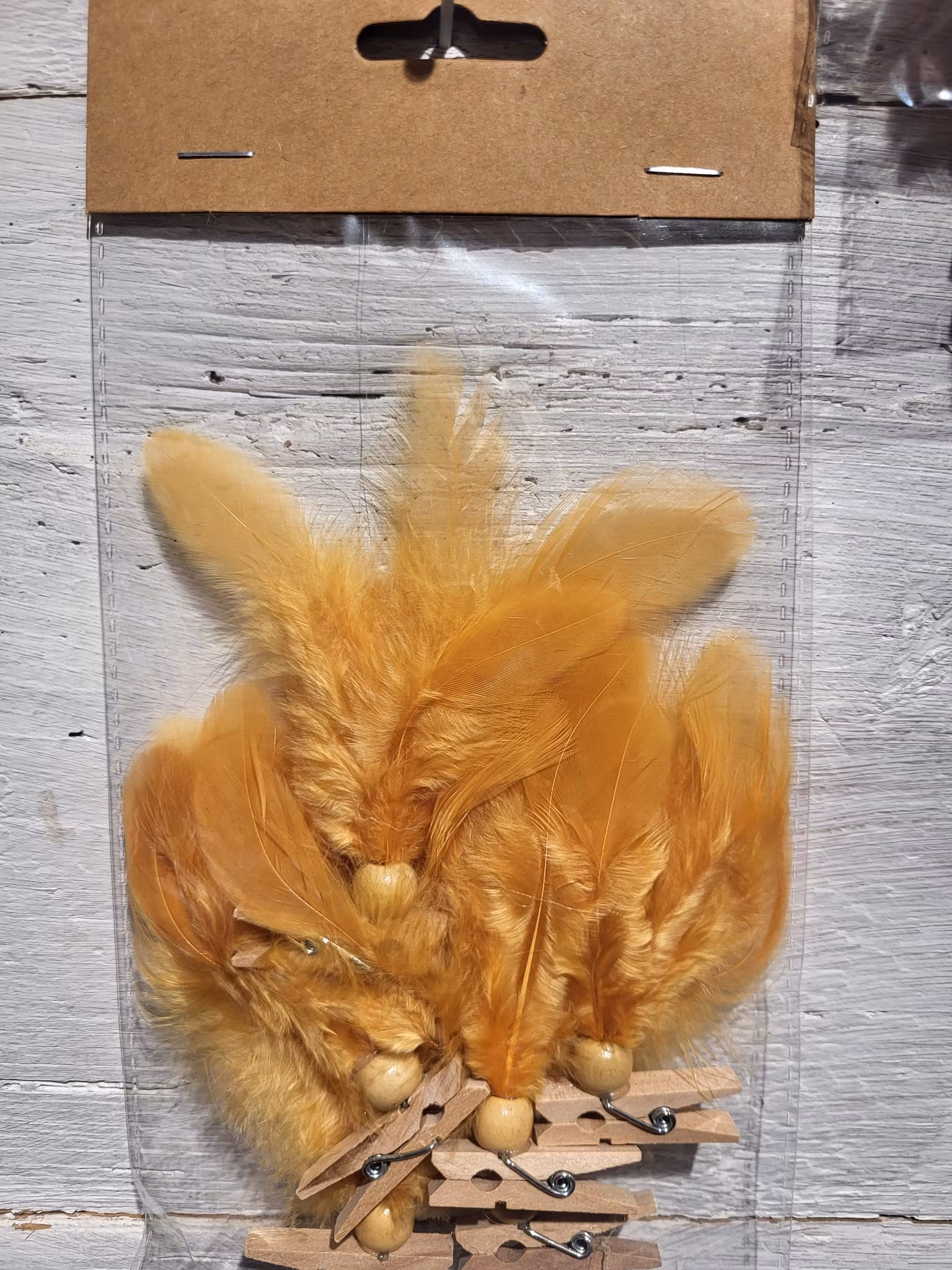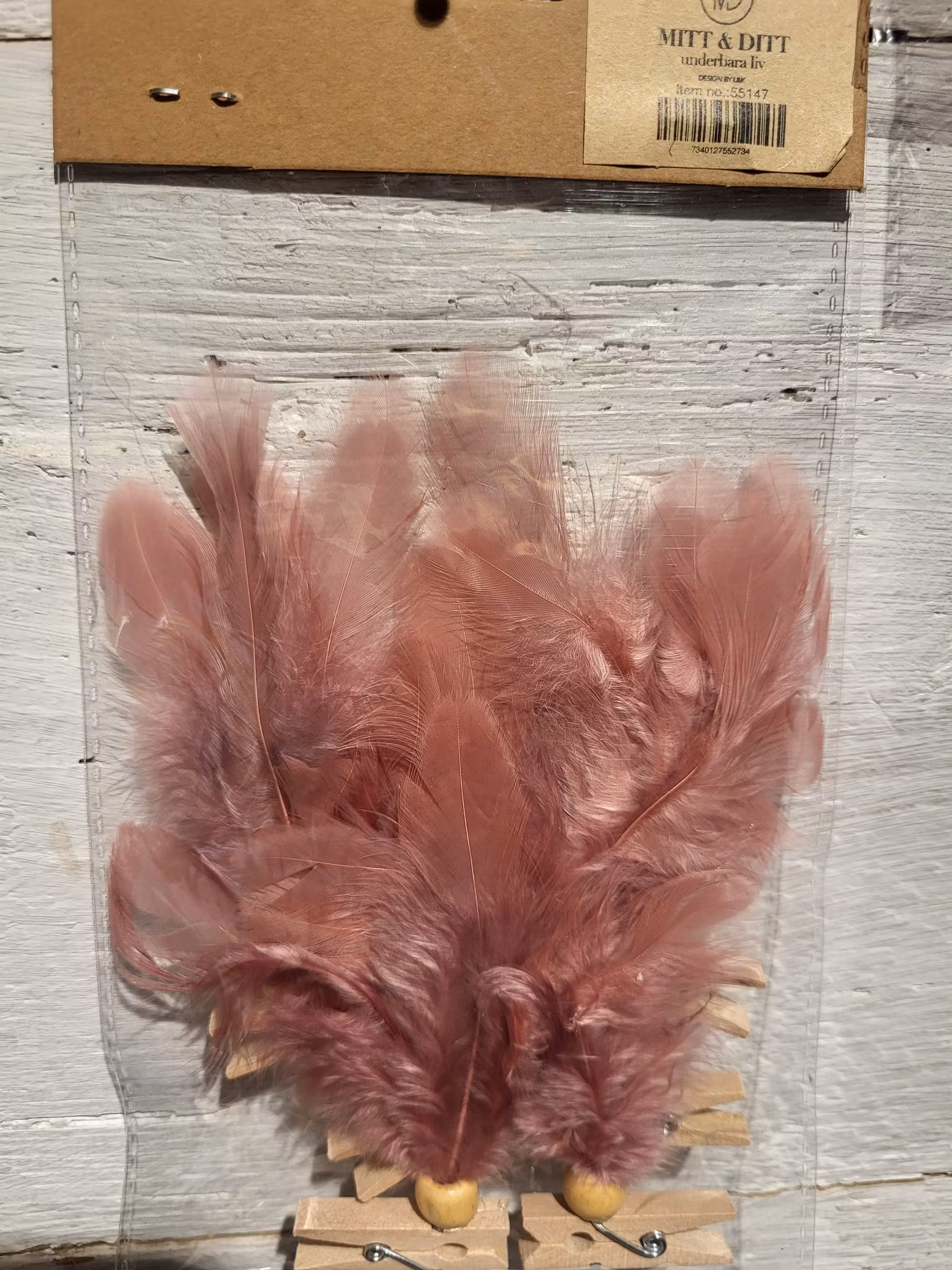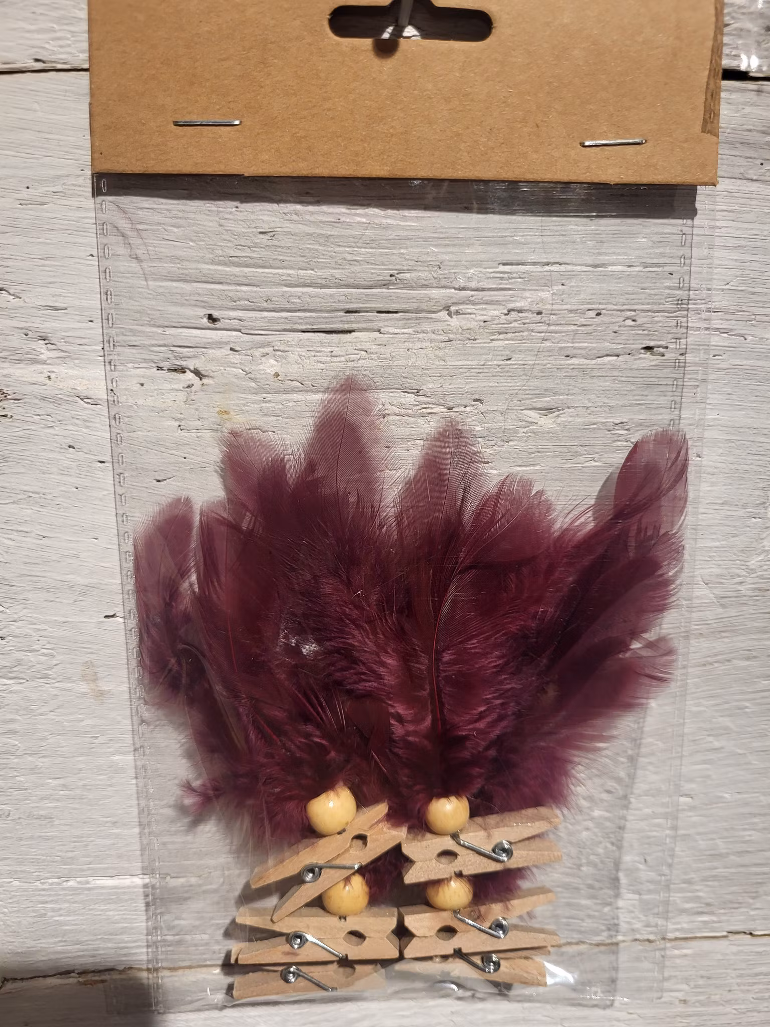 Fjäder clip med träklädnypa.Ligger packade 6st fjädrar i en påse. Säljs 6påsar/förpackning 8-10 cm. I tillverkningen har inga fjädrar tagits från levande fåglar. Fjädrarna är en biprodukt från livsmedelsindustrin.