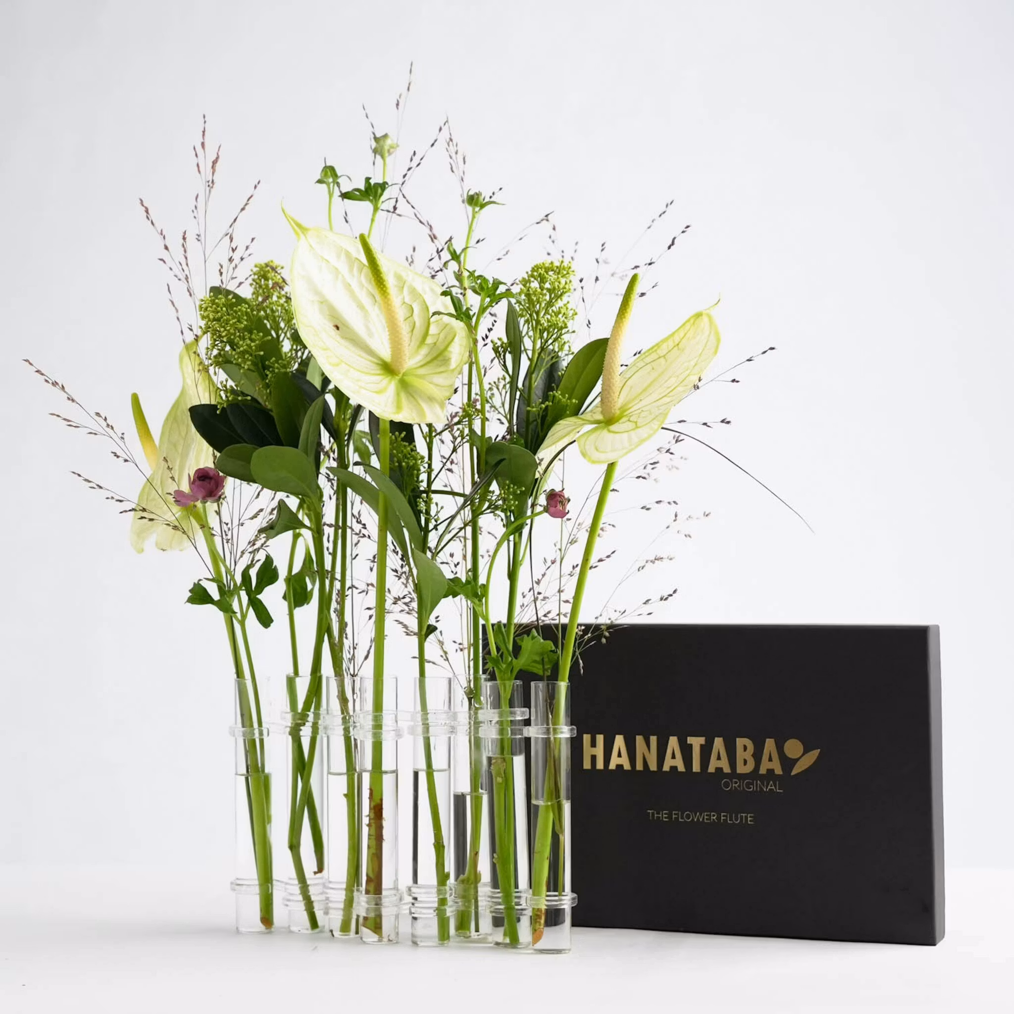 Flower Flute består av 8 glasrör. Levereras i en elegant mattsvart pappersask. Flower Flute är tillverkad av glasrör och plast. Handdisk rekommenderas.