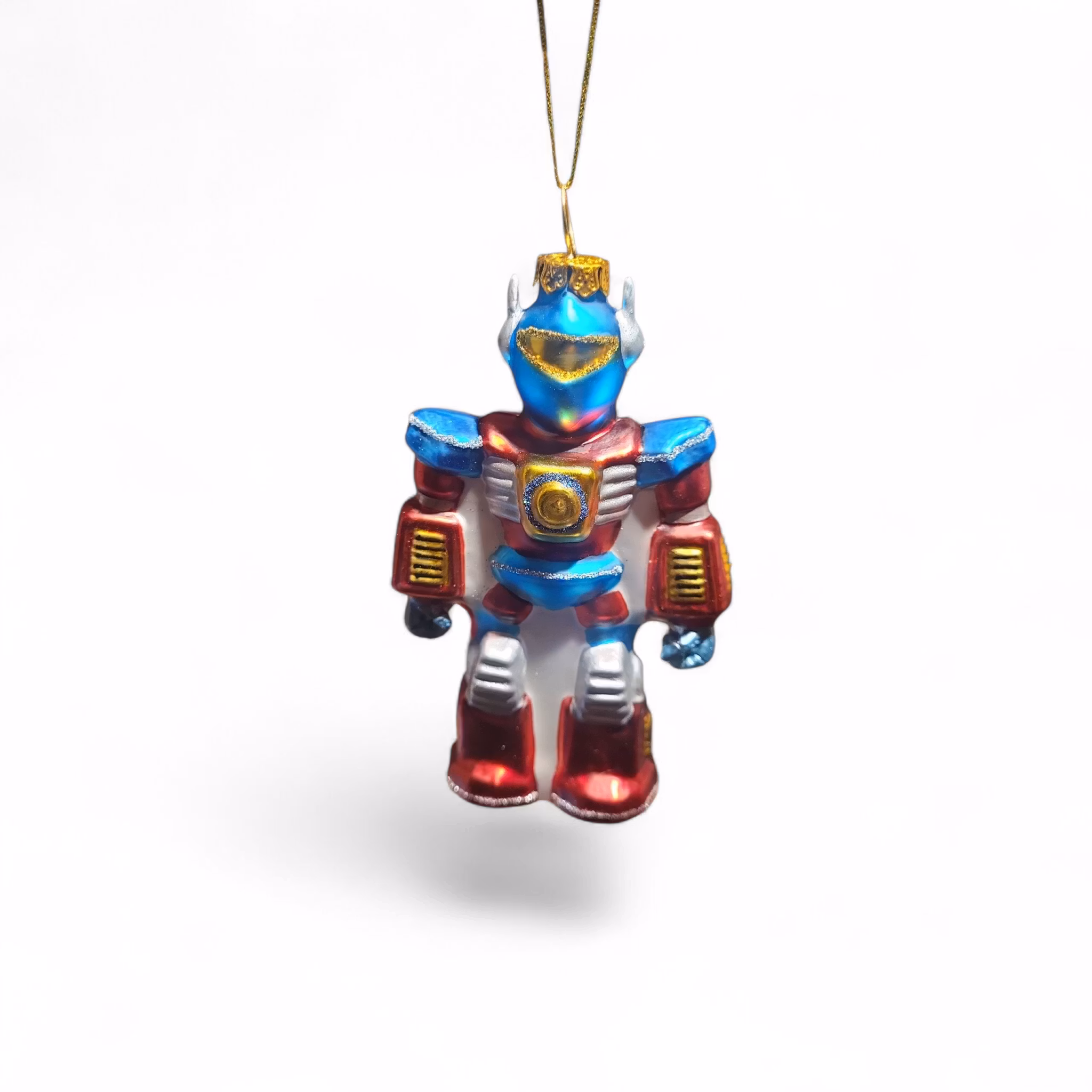 En juldekoration i glas som har formen av en robot i färgerna rött, blått och silver