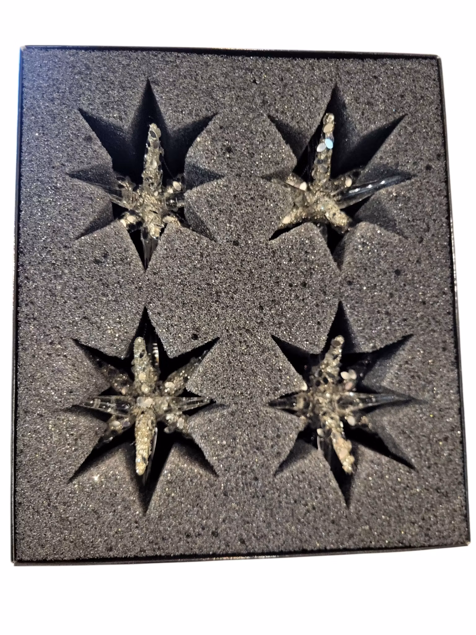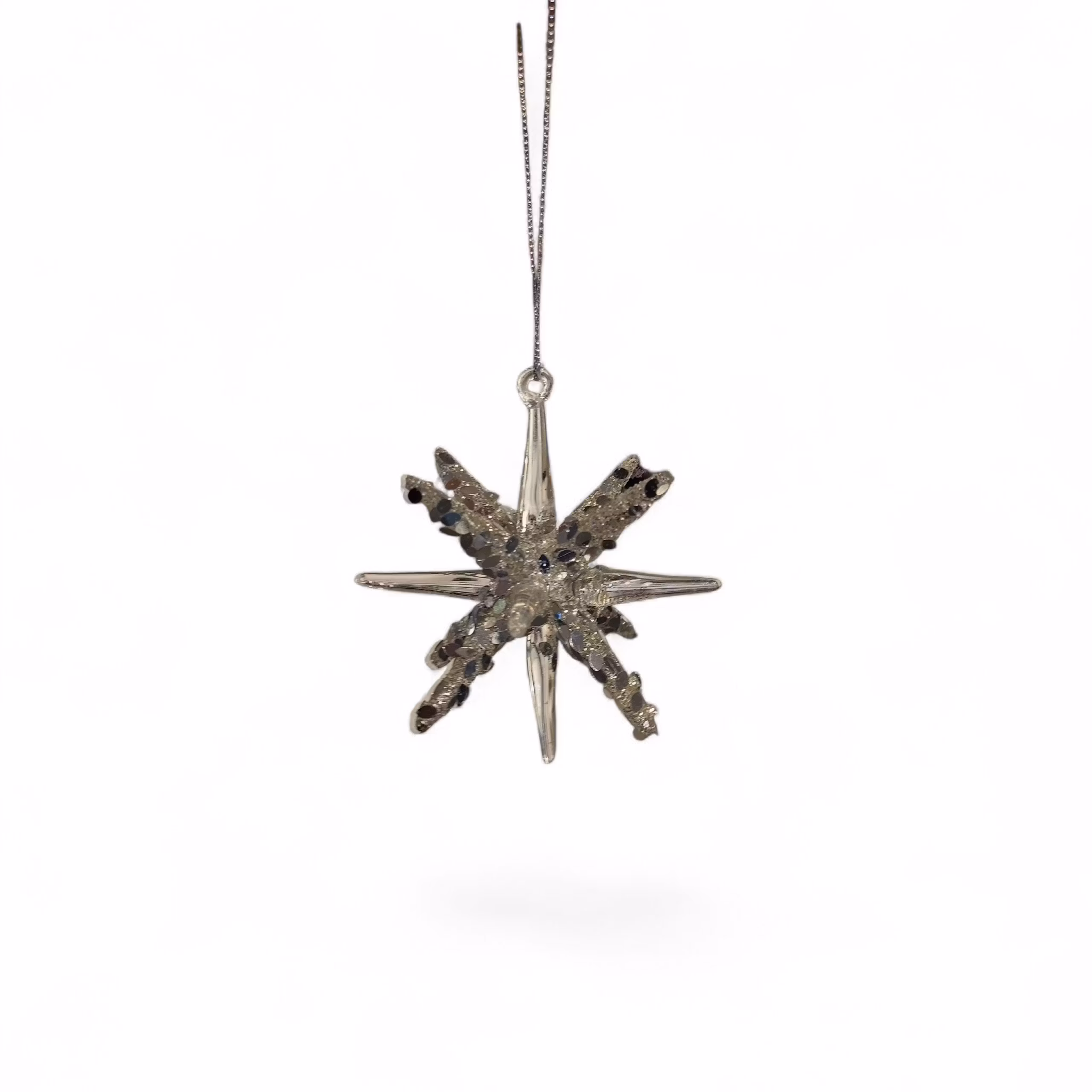 Juldekoration i formen av en tredimensionell stjärna. Halva i klarglas och den andra halvan med silverglitter och silvriga paljetter.