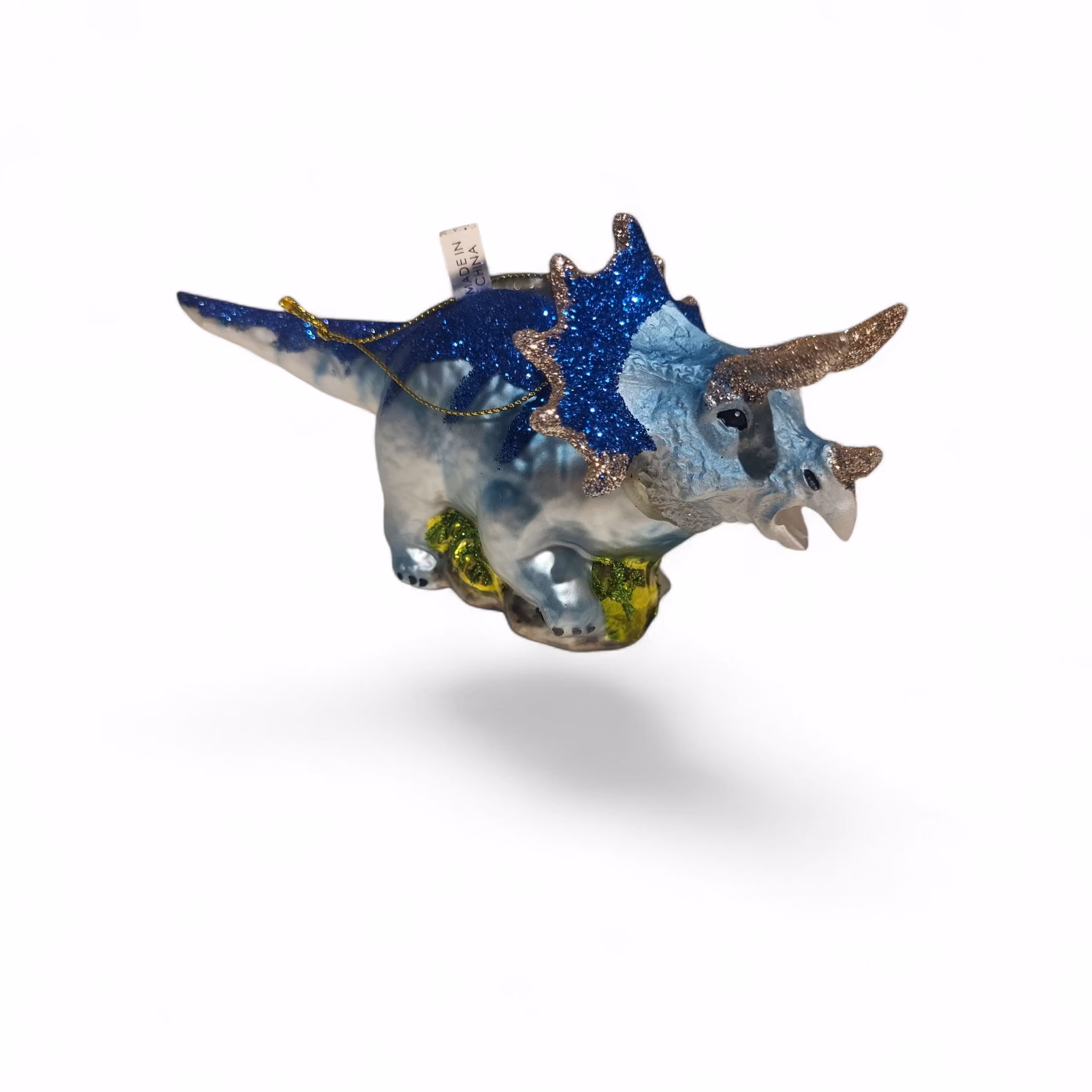 Juldekoration i form av en Triceratops. Figuren är dekorerad med glitter i blått och guld, kroppen är ljusblå med glansig yta.