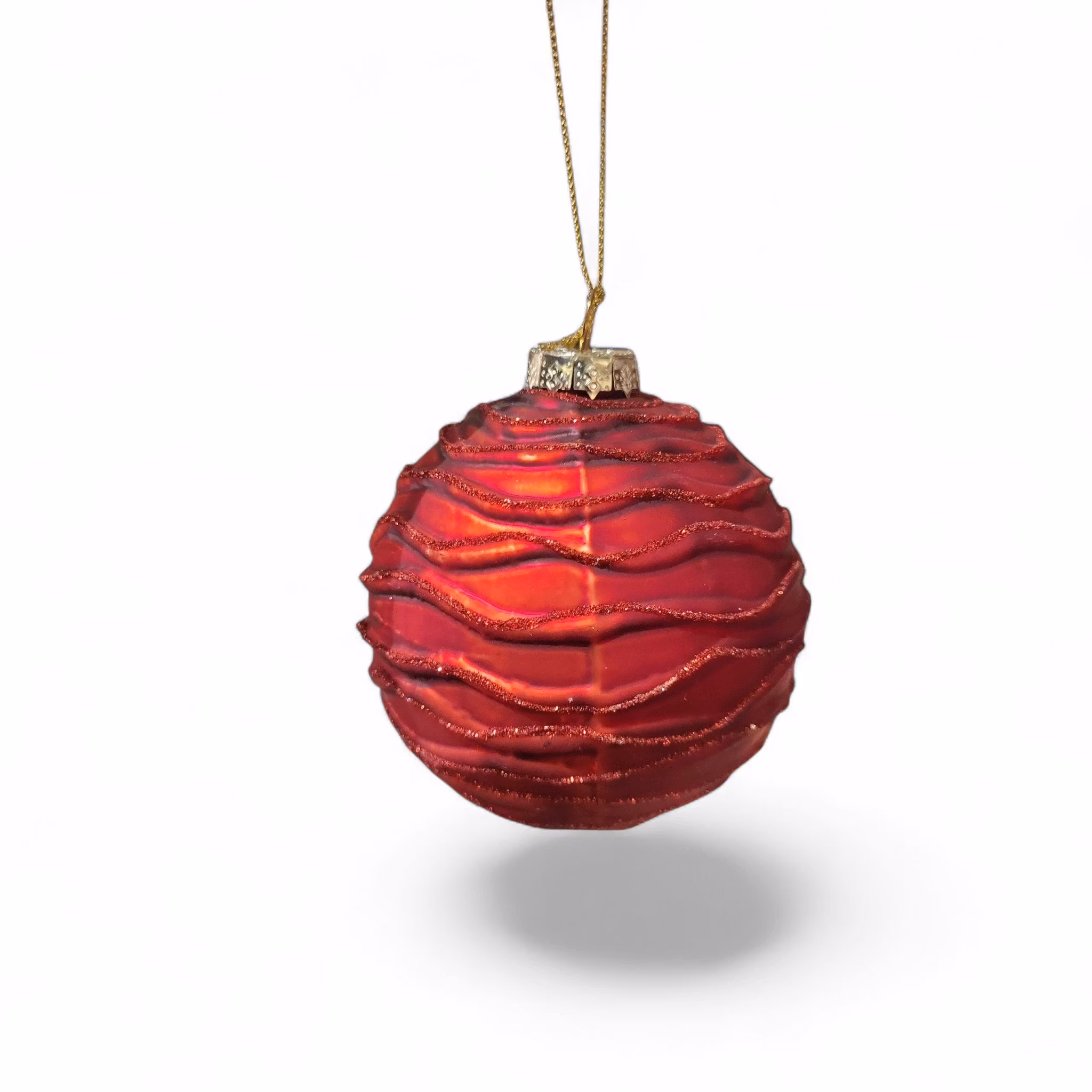 Julkula i glas. Röd att med ett vågigt/glittrigt mönster.