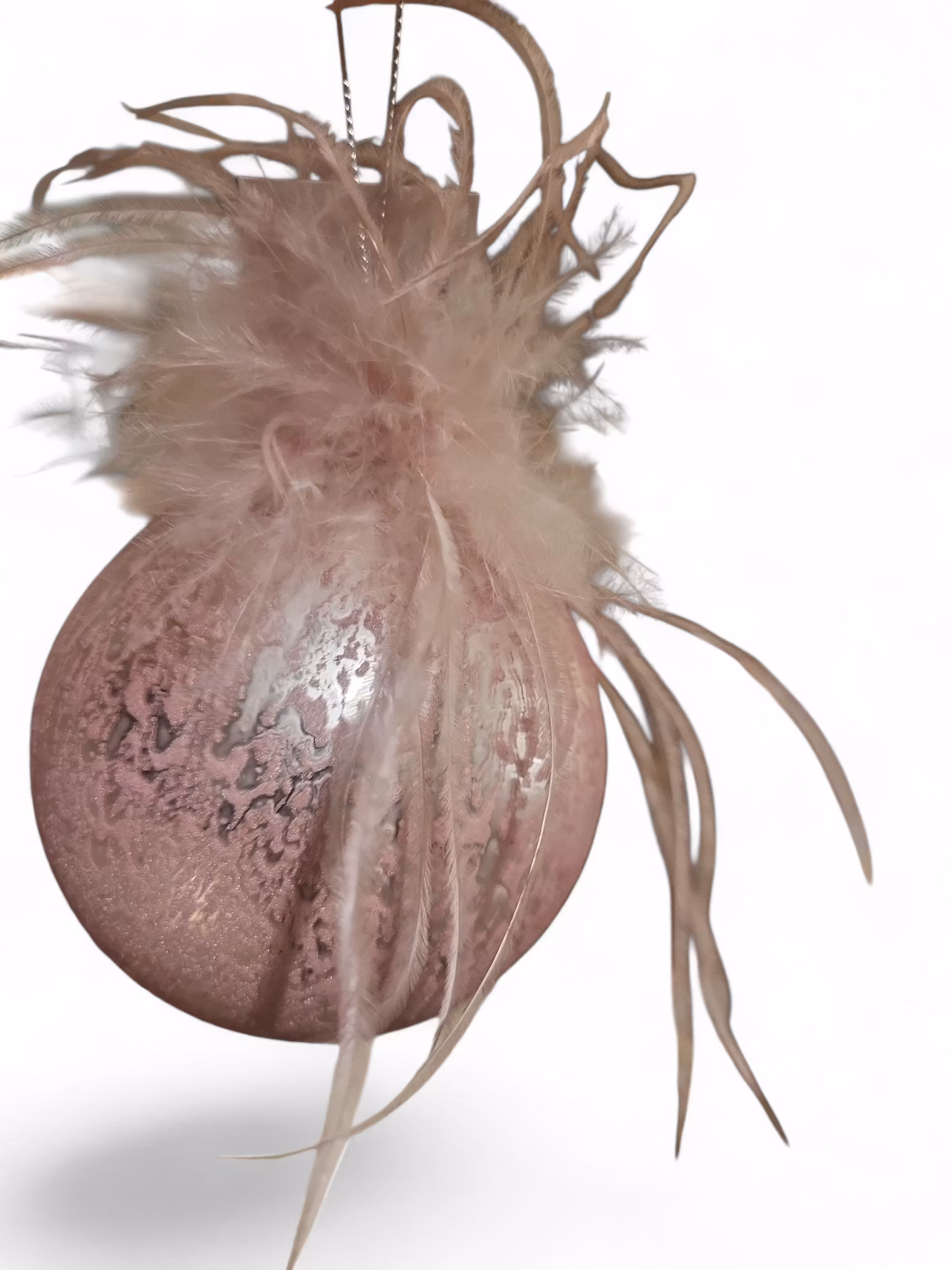 Julkula i glas med en rosa melerad nyans. Ovanpå pryds den av mjuka rosa fjädrar.
