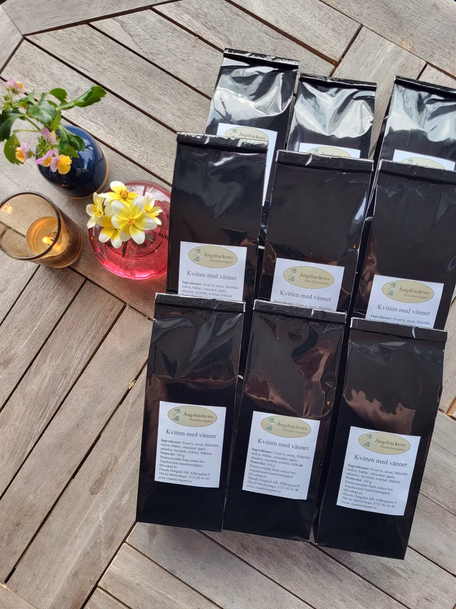 Svart te, arom, fläderbär, hallon, blåbär, citrusskal, äpple, rabarber, björnbär, rosblad, blåklint