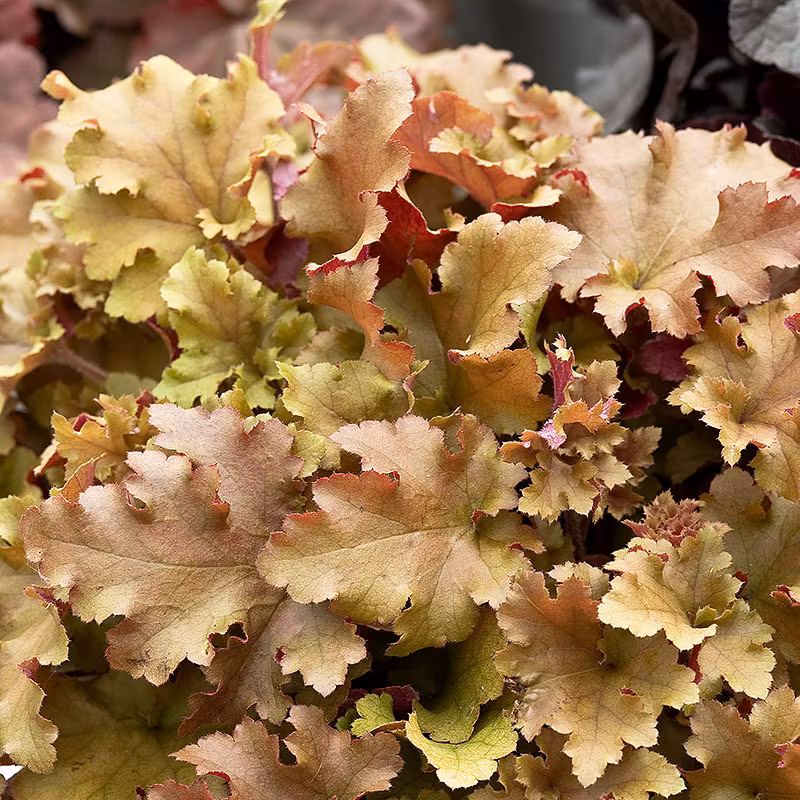 Alunrot, Heuchera ‘Marmalade’, är en kraftig och dekorativ perenn med vågiga, lätt vridna blad. Ovansidan är bronsfärgad och undersidan vinröd, vilket ger ett fint färgspel.