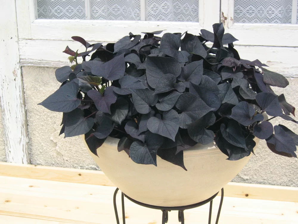 ‘Iposun Black Tone’ är en elegant och kraftfull bladväxt som ger planteringen ett exklusivt uttryck. De mörka, nästan svarta bladen skapar en dramatisk kontrast mot ljusa och färgstarka sommarblommor och ger djup åt både krukor och rabatter.