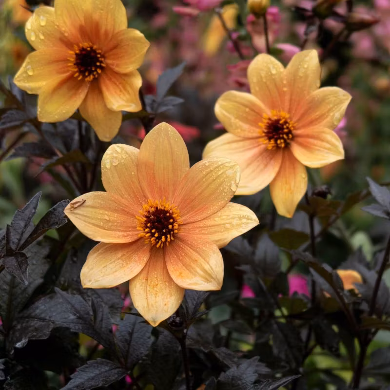 Dahlia MYSTIC Spirit Den här sorten är en dekorativ, lättodlad och färgstark dahlia med ett elegant mörkt bladverk och varma aprikos-/orangea blommor som lyser upp trädgården från sensommar till höst