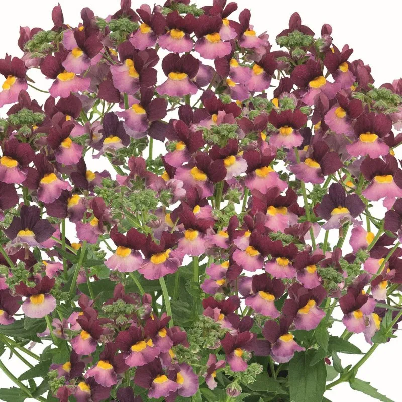Nemesia ’Fairy Kisses Boysenberry’ är en ljuvlig sort med vinröda och rosa blommor med gul mitt som blommar rikligt hela sommaren.